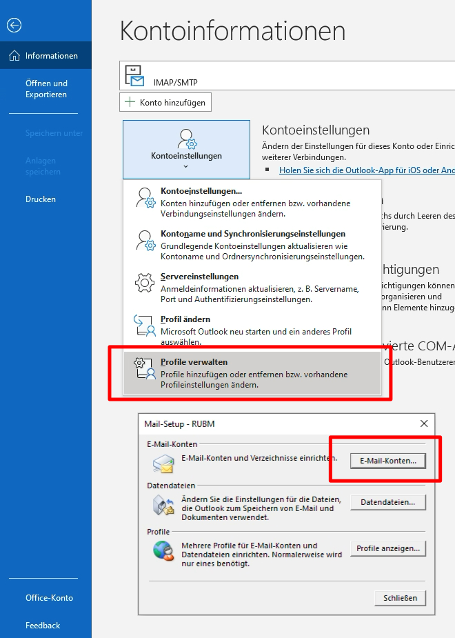 Um zu den Einstellungen zu gelangen, klicken Sie auf „Datei“, dann auf „Kontoeinstellungen“ und auf „Profile verwalten“. Sie gelangen zu dem E-Mail-Setup und können hier unter „E-Mail-Konten…“ anschließend ein neues Konto hinzufügen.