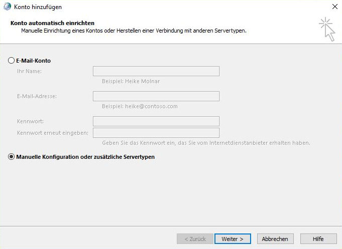 Klicken Sie auf die Schaltfläche „Neu…“, um ein neues Konto hinzuzufügen. Danach sehen Sie das folgende Fenster: An dieser Stelle ist es noch nicht nötig die Felder „Name“ etc. auszufüllen! Aktivieren Sie die Checkbox „Manuelle Konfiguration oder zusätzliche Servertypen“ und klicken auf „Weiter“.