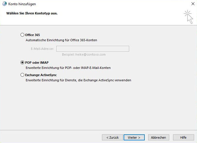 Wählen Sie im nun folgenden Fenster: „POP oder IMAP“ und klicken auf „Weiter“.