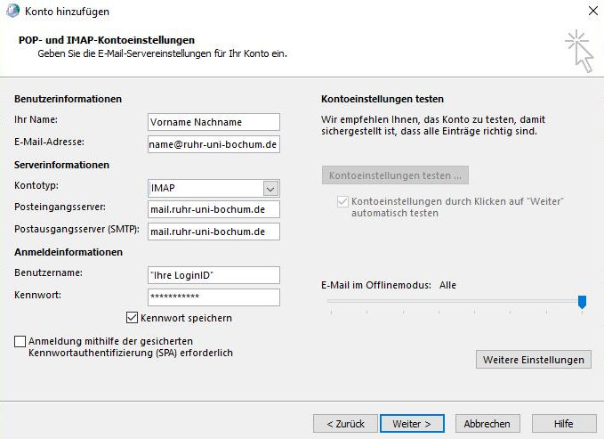 E-Mail: Ihre E-Mail-Adresse Kontotyp: IMAP Benutzername: Ihre RUB-LoginID